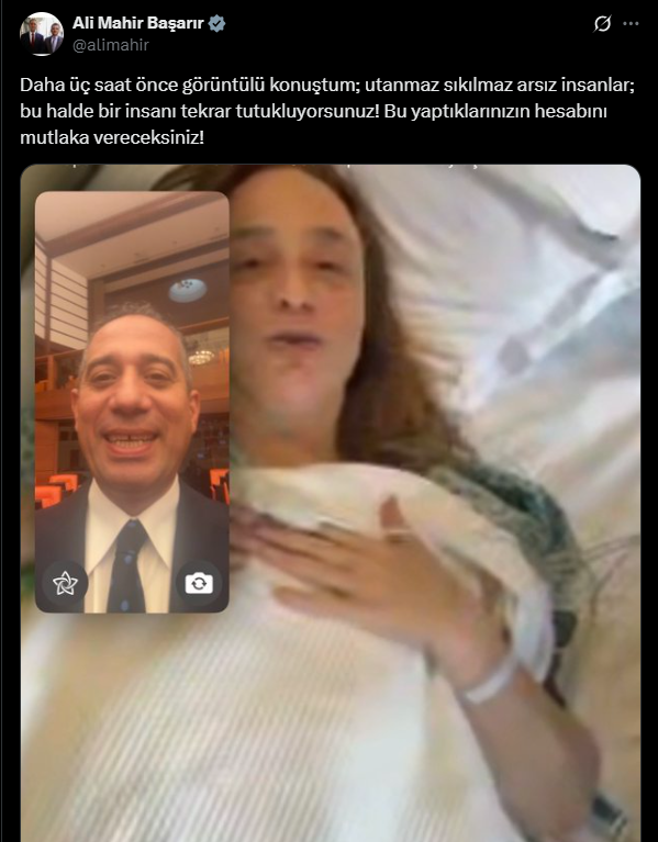 Başarır, Ayşe Barım ile hastane odasında gerçekleştirdiği görüntülü görüşmeden bir kareyi paylaşarak, "Daha üç saat önce görüntülü konuştum; utanmaz, sıkılmaz, arsız insanlar! Bu halde bir insanı tekrar tutukluyorsunuz! Bu yaptıklarınızın hesabını mutlaka vereceksiniz!" ifadelerini kullandı.