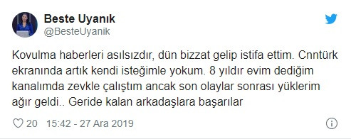 CNN Türk’te ‘Günün Ekonomisi’ programını sunan Beste Uyanık, kanaldan kovulduğu iddiasına ilişkin "Kovulma haberleri asılsızdır, dün bizzat gelip istifa ettim. Cnntürk ekranında artık kendi isteğimle yokum. 8 yıldır evim dediğim kanalımda zevkle çalıştım ancak son olaylar sonrası yüklerim ağır geldi.. Geride kalan arkadaşlara başarılar." açıklamasını yaptı.