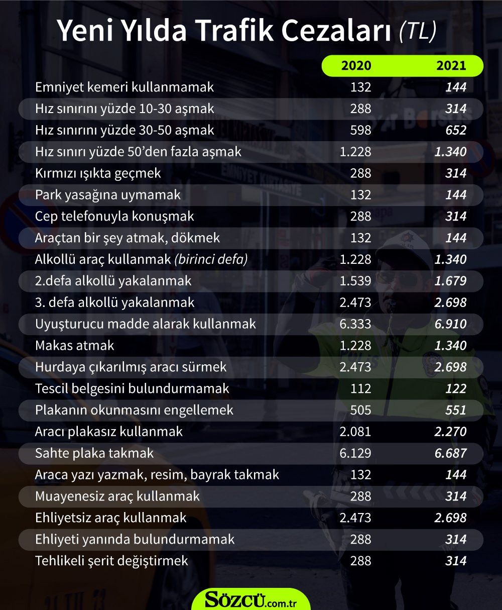 Sözcü gazetesinden Erdoğan Süzer'in haberine göre, Yeni yılın sabahına yüzde 9.11'lik vergi, ceza ve harç zamlarıyla uyanacağız. 1 Ocak 2021'den itibaren devletin halktan topladığı vergi ve harçlarla başta trafik cezası olmak üzere her türlü para cezaları yüzde 9.11 oranında artacak.