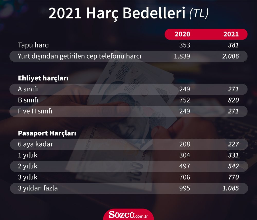 Ehliyet harçları da yüzde 9.11 artışla A sınıfı için 271 liraya, B sınıfı 820 liraya, 6 aylık pasaport harcı 227 liraya, 1 yıllık pasaportlar 331, 3 yıllık pasaportlar 770 liraya çıkacak. Tapu harcı da 381 lira olacak.