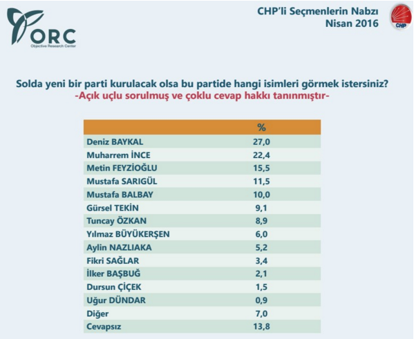 ORC Araştırma'nın CHP'li Seçmenlerin Nabzı Nisan 2016 anketi sonuçları yayınlandı.