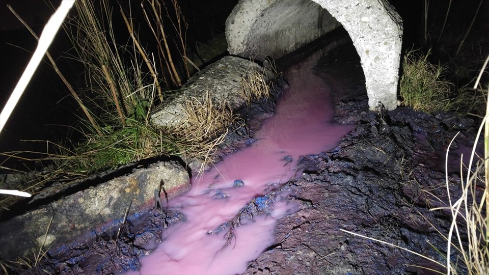 Tamamen pembe ve kırmızı renge bürünen dere çevre kirliliğini gözler önüne serdi.