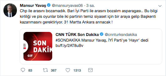İKİ gün önce İYİ Parti Genel Başkanı Meral Akşener'le görüşen Mansur Yavaş'ın İYİ Parti'nin Ankara Büyükşehir Belediye Başkanı adayı olmak istemediği öne sürüldü. CNN TÜRK Ankara Temsilcisi Dicle Canova'nın "Mansur Yavaş İYİ Parti'ye hayır dedi" haberi siyaset kulislerine bomba gibi düşerken, Mansur Yavaş'tan jet yalanlama geldi. Mansur Yavaş sosyal medya hesabından yaptığı açıklama ile o iddiayı yalanladı."CHP ile arasını bozamadık. Bari İyi Parti ile arasını bozalım asparagası" diyen Yavaş, "Bu bilgi kirliliği ve pis oyunlar bile iki partinin temiz siyaset için bir araya gelip Başkenti kazanmasını gerektiriyor. İttifakı önleyemeyeceksiniz. 31 Martta Ankara arınacak!" dedi.