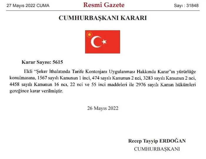 Resmi Gazete'nin bugünkü sayısında Başkan Recep Tayyip Erdoğan'ın imzasıyla yayımlanan karar göre, 'Şeker İthalatında Tarife Kontenjanı Uygulaması Hakkında Karar' yürürlüğe girdi.
