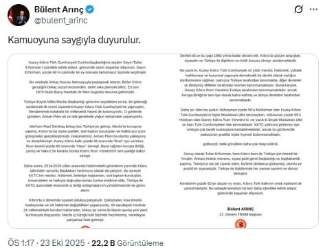 AKP kurucusu ve eski TBMM Başkanı Bülent Arınç, sosyal medya hesabından yaptığı açıklamada, “Erhürman hem Kıbrıs hem de Türkiye için önemli bir fırsattır” diyerek, Türkiye’de bazı çevrelerin seçim sürecine yanlış şekilde müdahil olduğunu savundu.