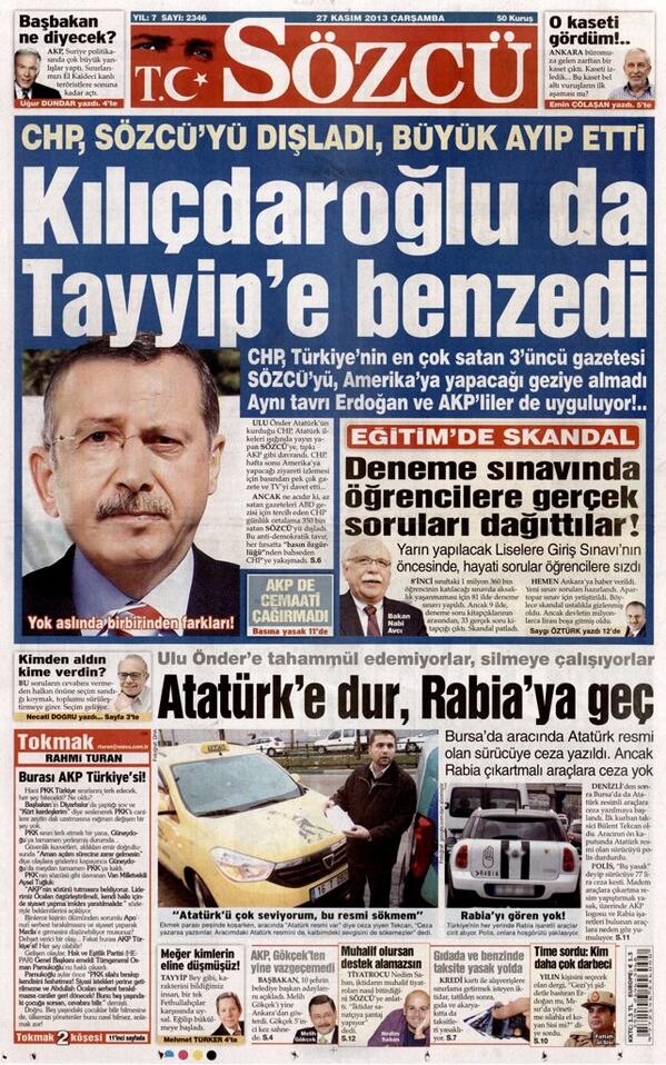 Gazete, konuyla ilgili rahatsızlığını Başbakan Recep Tayyip Erdoğan ve Kemal Kılıçdaroğlu'nun yüzlerini yan yana koydu ve "Kılıçdaroğlu da